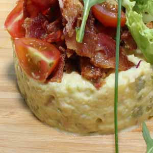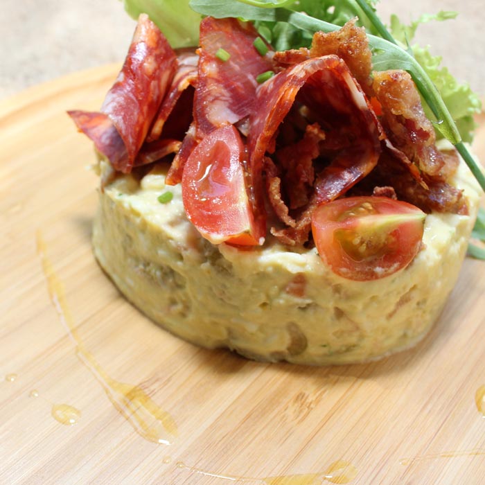 Tomate, Mozzarella, Paletilla y Taquitos de Jamón Ibérico, Huevos de Codorniz y Rúcula
